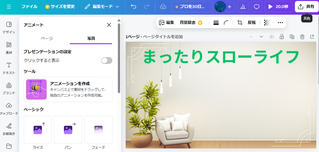 キャンバ(Canva)を立ち上げます。無料の範囲内で十分使えます。