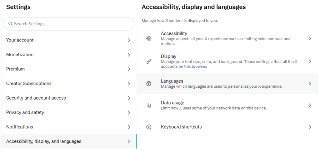 「Accessibility, display, and languages(アクセシビリティ、表示と言語)」→「 Languages(言語)」をクリックする。