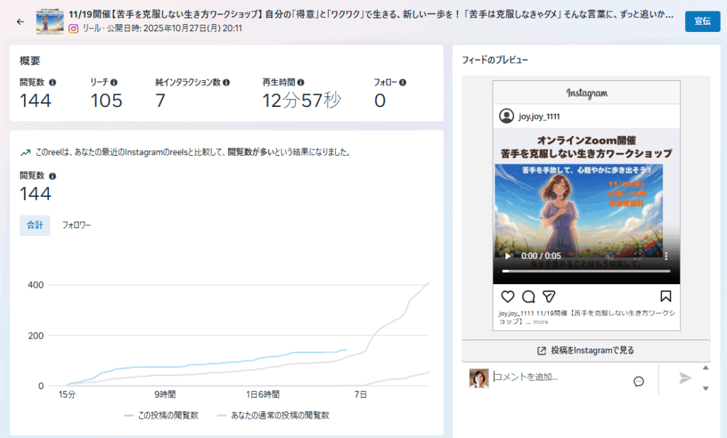Instagramリールでは圧倒的に閲覧数・リーチが増加。時間帯がよかったのか、短尺動画という特性もあり、通常の投稿よりも圧倒的に多くのユーザーに届いたようです。