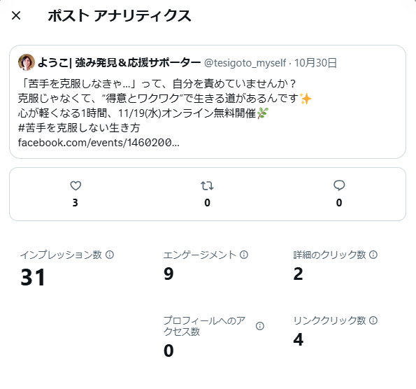 noteでは長期間にわたり安定した閲覧・支持が得られていることがわかります。エンゲージメント(スキ数)は他SNSより高く、読者層の関心が持続的に深まっていることがうかがえます。しかし、ワークショップへの申込者なし。