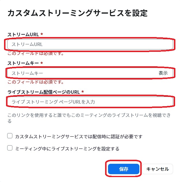 先ほどのYouTube Studioでコピーした「ストリームURL」と「ストリームキー」「ライブストリーム配信ページのURL」をZoom側の設定入力画面に貼り付け、設定を保存します。