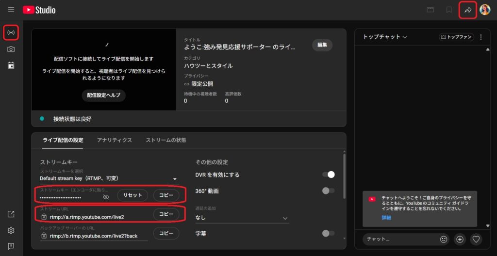 ライブ配信設定画面で、「ストリームキー」と「ストリームURL」が生成されているので、コピーします。