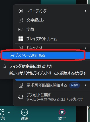 Zoom側は、「詳細」→「ライブストリームを止める」をクリックします。