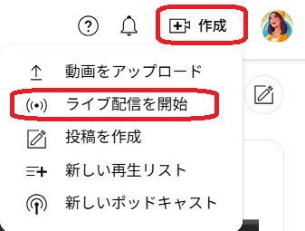 YouTubeにログインし、右上のカメラアイコン「作成」→「ライブ配信を開始」をクリックします。