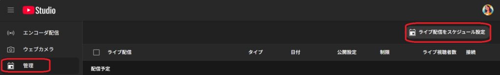 YouTube Studioの「ライブ配信」画面に入ったら、「管理」から「ライブ配信をスケジュール設定」をクリックします。