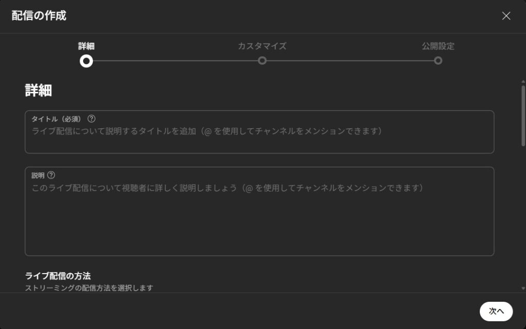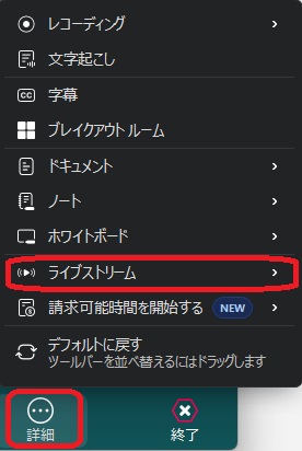 画面下の「詳細」メニューをクリックすると、「ライブストリーム」が追加されています。