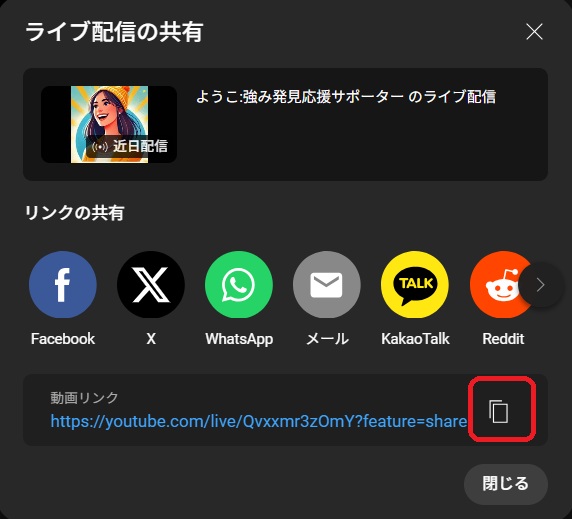 画面右上の赤枠の共有をクリックして、「動画リンクのURL」もコピーして控えておく(コラボする方や視聴者にシェアするURL)。