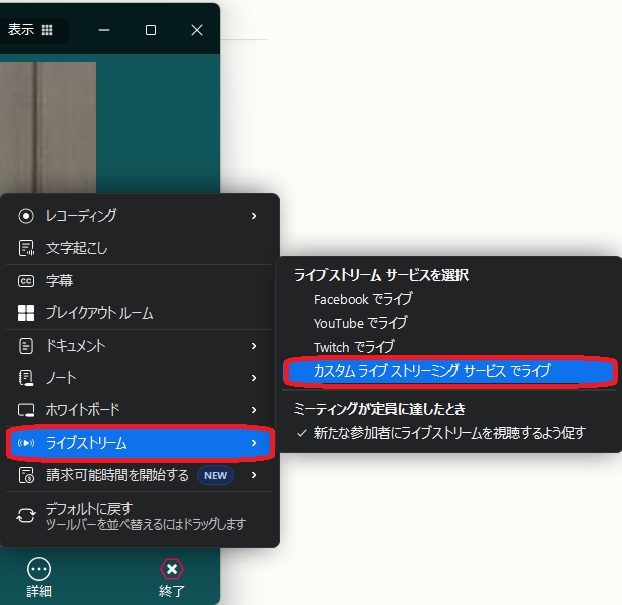 この設定をすることにより、Zoomミーティングを開始すると、画面下「詳細」メニューに「ライブ配信できる項目が追加表示されるようになります。
