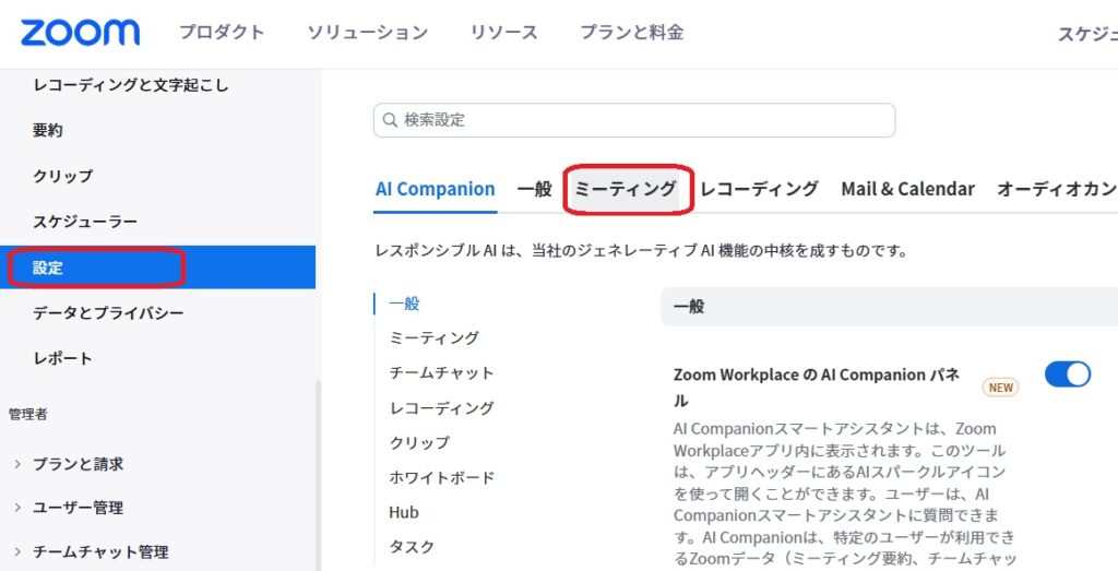 左のメニューから「設定」をクリックし、「ミーティング」タブをクリックします。