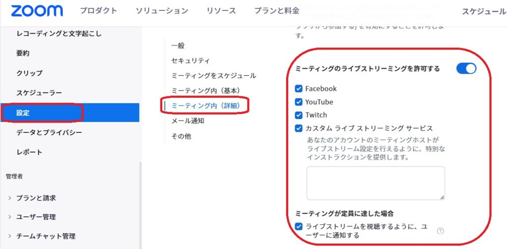 「ミーティング」→「ミーティング内(詳細)」タブをクリックして「ミーティングのライブストリーミングを許可する」の有効化をオンにします。